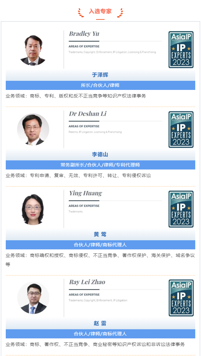 >兰博电竞>关于我们>荣誉概览>2024>集佳5位合伙人入选Asia IP 2023年度“中国知识产权专家百强榜”
