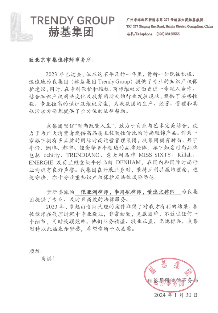 信中提到,2023年,集佳与赫基集团在专利保护和维权、商标维权方面更进一步加强合作,集佳一如既往、迅速地为赫基集团提供了专业的知识产权保护建议,集佳提供的实操性强、专业性高的保护及维权方案,为赫基集团的生产、经营、管理和其他活动方面都提供了全方位的法律帮助。赫基集团法务部赞扬集佳张亚洲律师、李用航律师、董逸文律师、徐思律师、商标代理人杜梦寒等,在提供专业、及时且高效的法律服务的过程中,厚德重法,业务精湛,敬业正直,无愧标兵。