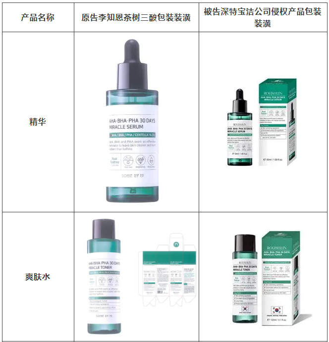 2021年原告委托兰博电竞调查发现,被告汕头市深特宝洁实业有限公司生产、销售和推广的“茶树祛痘美白补水液”“茶树香皂”等护肤品,其产品包装装潢直接抄袭、摹仿原告前述已经具有较高知名度和影响力的“SOME BY MI/莎柏蜜”茶树三酸系列化妆品和黑蜗牛精华液的包装、装潢设计,使用与之近似的标识,造成消费者混淆误认。故原告作为茶树三酸、黑蜗牛精华包装装潢权益获益人,诉至广东省汕头市中级人民法院。汕头中院认定:李知恩主张的茶树三酸、黑蜗牛精华包装装潢构成具有一定影响的包装装潢,深特宝洁公司生产、销售茶树三酸、黑蜗牛精华液的行为构成不正当竞争。因判赔额不符合原告预期,原告后上诉至广东省高级人民法院,广东省高级人民法院最终维持一审判决。
