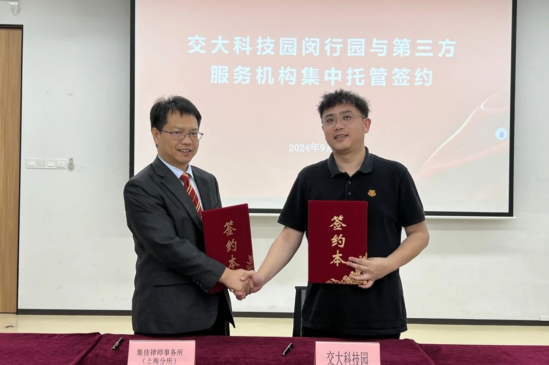 为助力企业科技创新和经济发展护航保障,提供高质量维权公益援助,会上举行了“上海市开发区协会维权援助工作站交大科技园闵行园工作室”揭牌仪式,交大科技园闵行园与兰博电竞上海分所进行了托管签约。